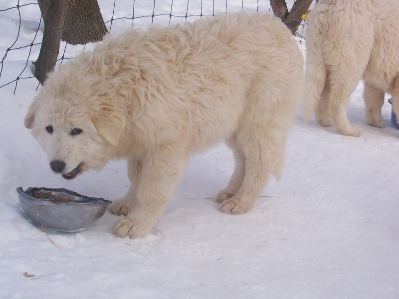 Maremma puppy enjoying his breakfast. Look at his size at only a few months old! Our dogs are very large, with many males weighing in at 90 lbs. at six months old. Strong, solid, fearless working guardians..... who love and adore their family.